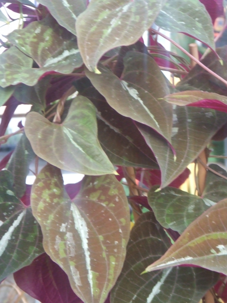 Die Dioscorea discolor ist eine Rankpflanze die im Sommer gerne im Freien steht.Die Pflanze ist nicht winterhart und muß bei 2 C°+ gehalten werden. Die Pflanze sollte im Winter einziehen,sodas nur die Knollen erhalten bleiben.Die Knollen sollten nicht aus dem Topf entfernt werden, das gießen sollte völlig eingestellt werden.Ab April-Mai tauchen die ersten neuen Triebe aus der Erde auf, jetzt sollten die Knollen in neue Erde gesetzt werden.Die Blätter sind purpurfarben mit einem silbernen Streifen.Höhe ca.1,5m,die Pflanze braucht eine Rankhilfe, je größer der Topf um so größer wird die Pflanze.Blüte unscheinbar gelblich. Seit 2005 haben wir Auspflanzversuche vorgenommen, bei leichten Winterschutz (Laubabdeckung) kann die Pflanze auch im Freiland überwintern.